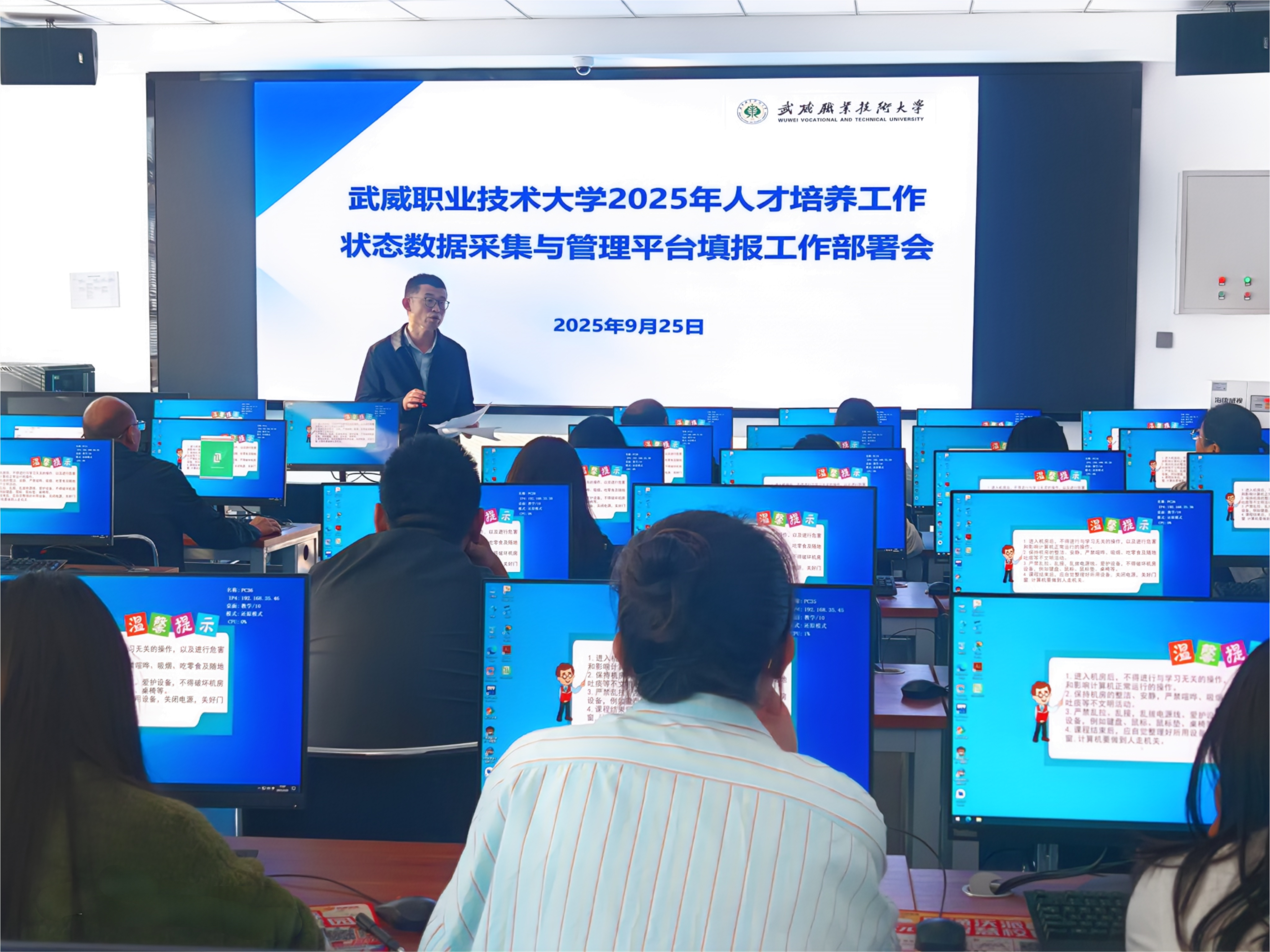 為深入貫徹落實(shí)教育部職成司《關(guān)于做好職業(yè)教育2024-2025學(xué)年數(shù)據(jù)采集工作的通知》精神,根據(jù)《甘肅省教育廳關(guān)于開展全省職業(yè)教育2024—2025學(xué)年信息數(shù)據(jù)采集工作的通知》要求,確保學(xué)校2025年人才培養(yǎng)工作狀態(tài)數(shù)據(jù)采集工作高效、有序開展。9月25日,教務(wù)處在篤行樓3樓機(jī)房組織召開學(xué)校2025年人才培養(yǎng)工作狀態(tài)數(shù)據(jù)采集工作部署會議。教務(wù)處、各學(xué)院(部)數(shù)據(jù)填報(bào)相關(guān)工作人員參加會議。