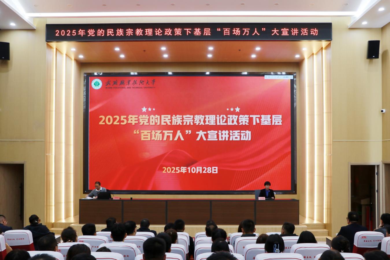 10月28日,2025年黨的民族宗教理論政策下基層“百場萬人”大宣講活動在武威職業(yè)技術(shù)大學(xué)成功舉行?;顒犹匮拭C農(nóng)業(yè)大學(xué)黨委統(tǒng)戰(zhàn)部常務(wù)副部長唐致剛作專題宣講,學(xué)校黨委理論學(xué)習(xí)中心組成員、中層干部、輔導(dǎo)員、班主任共110人聆聽了講座。
