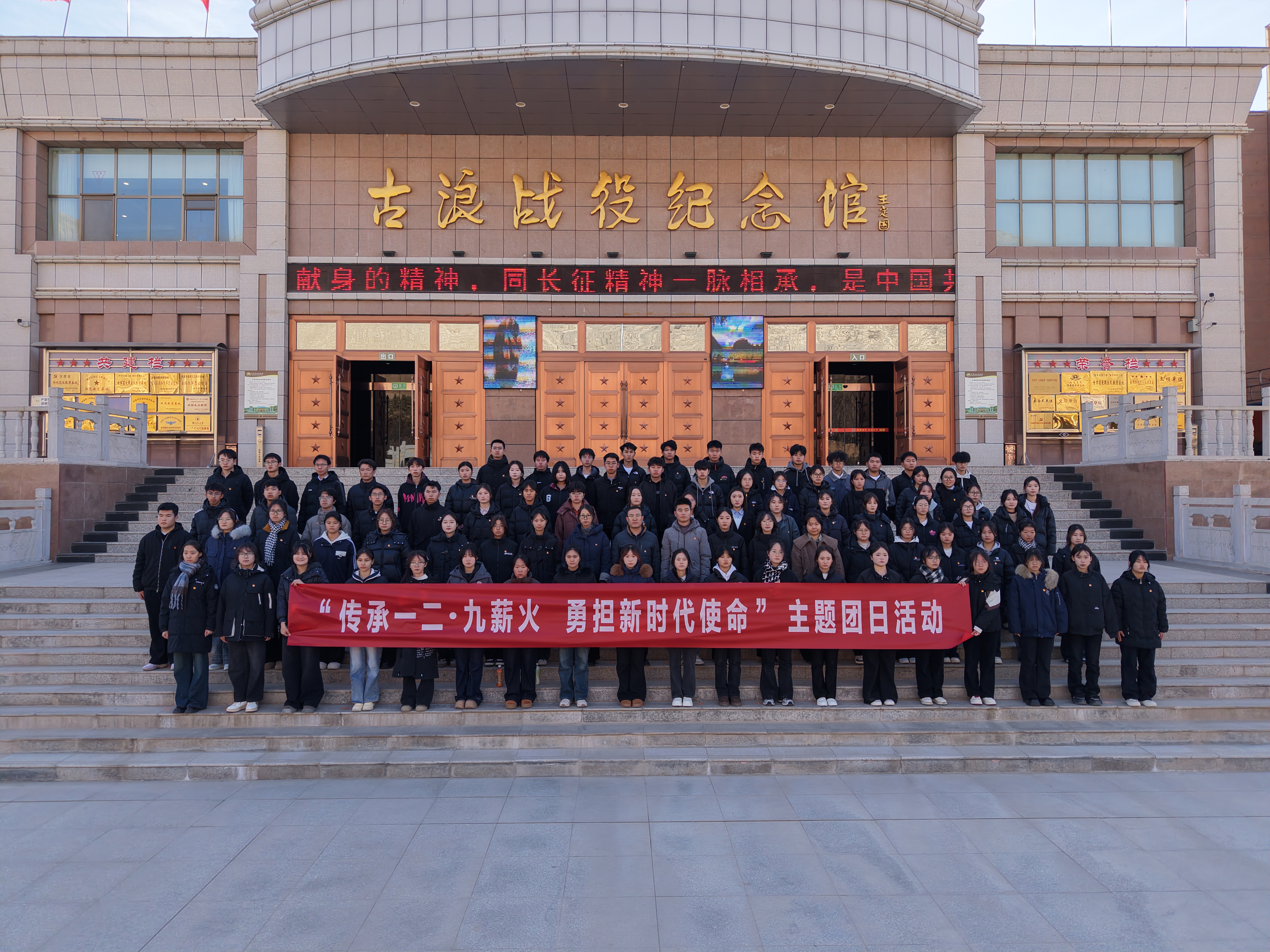 為深切緬懷革命先烈,弘揚(yáng)愛(ài)國(guó)主義精神,加強(qiáng)團(tuán)員青年思想政治引領(lǐng),12月6日,學(xué)校團(tuán)委在古浪戰(zhàn)役紀(jì)念館組織開(kāi)展紀(jì)念“一二 · 九”運(yùn)動(dòng)主題團(tuán)日活動(dòng)暨新發(fā)展團(tuán)員集中入團(tuán)儀式。學(xué)校團(tuán)委全體干部,2025年下半年新發(fā)展團(tuán)員代表,團(tuán)學(xué)干部代表共計(jì)100人參加了活動(dòng)。
